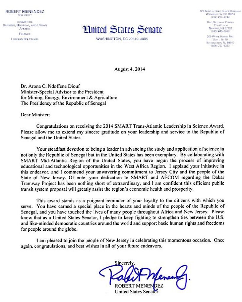- Lettre de Félicitations au Nom du Sénat Américain et des Citoyens des Etats-Unis adressée au Dr. Diouf, Récipiendaire du Prix d’Excellence 2014 Trans-Atlantic Leadership in Science Award.